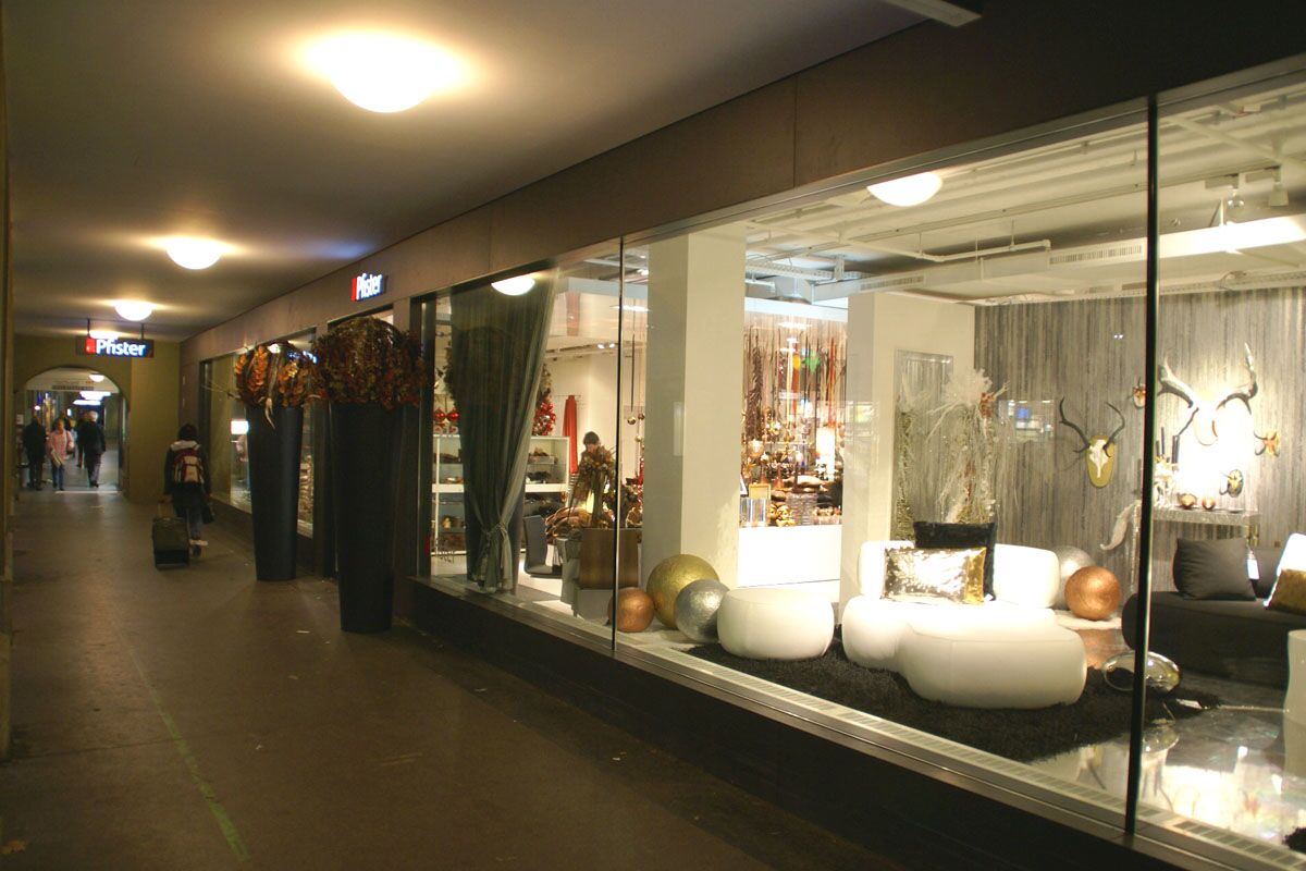 Schaufensteranlagen können sehr unterschiedlich gestaltet werden. Doch eines haben sie alle gemeinsam: Sie sollen einen optimalen Einblick auf die ausgestellte Ware ermöglichen. Deshalb setzen wir wenn möglich auf grossflächige Verglasungen mit möglichst geringem Rahmenanteil. Falls gewünscht, verzichten wir sogar ganz auf vertikale Profile und führen SSG Verglasungen aus (Glas - Glas profillos aneinander gestossen).
