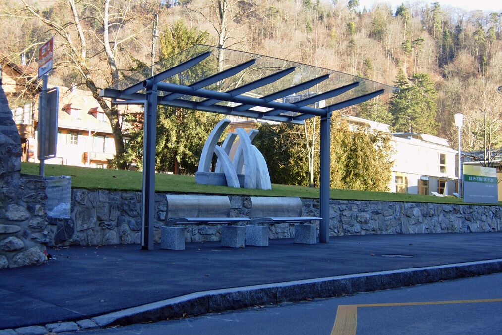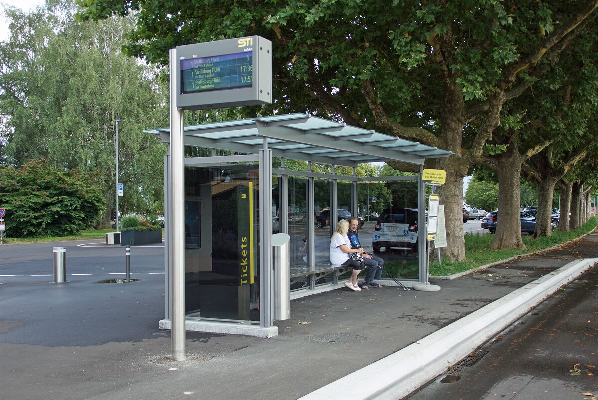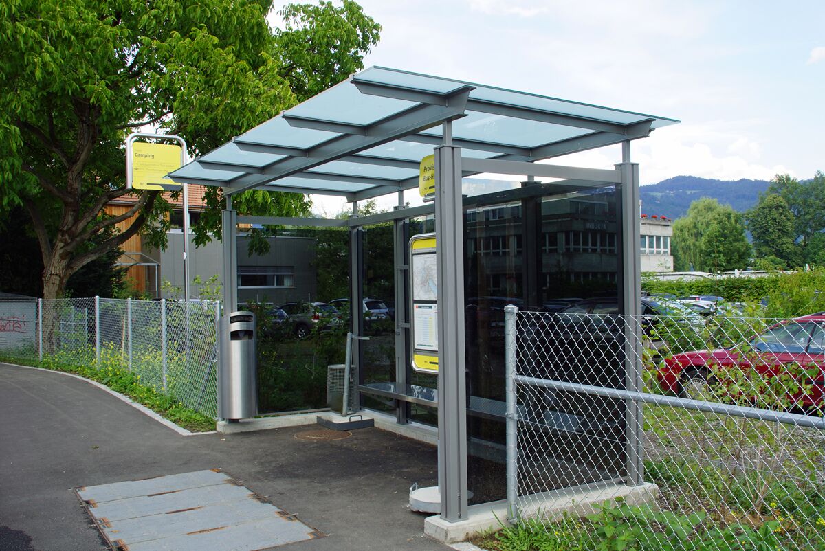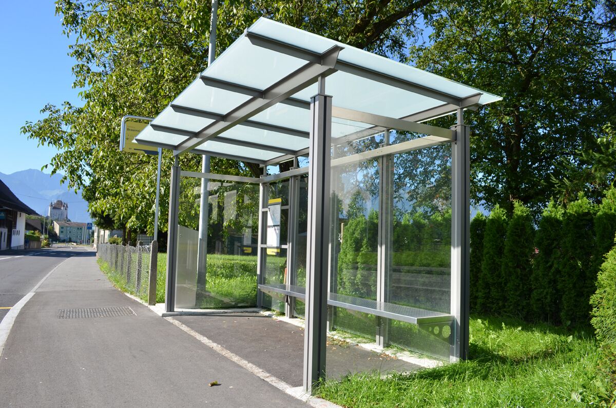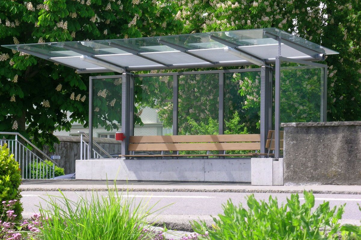 Unterstände im eigenentwicklten System PESO© werden im öffentlichen Bereich eingesetzt, um den wartenden Busfahrgästen Zuflucht und Schutz vor Wind und Wetter zu bieten.