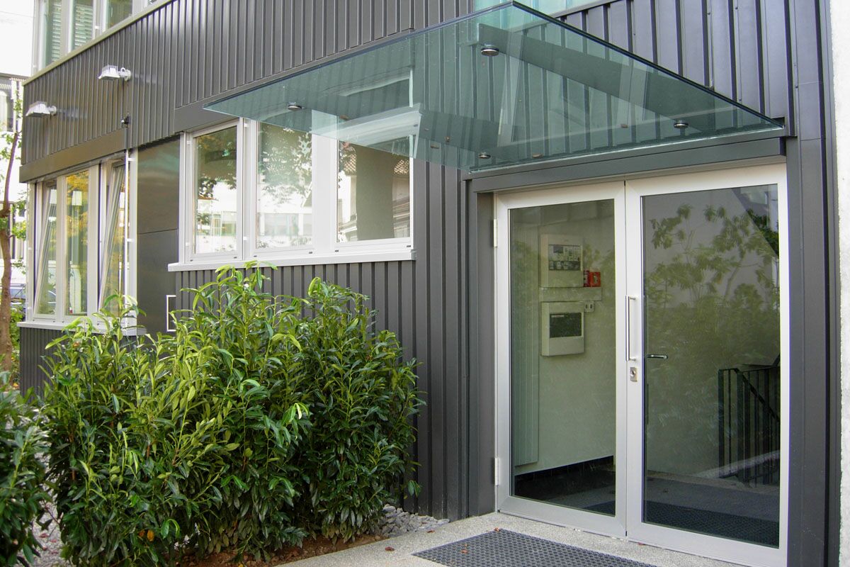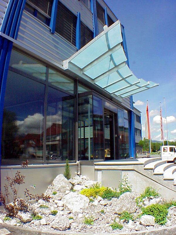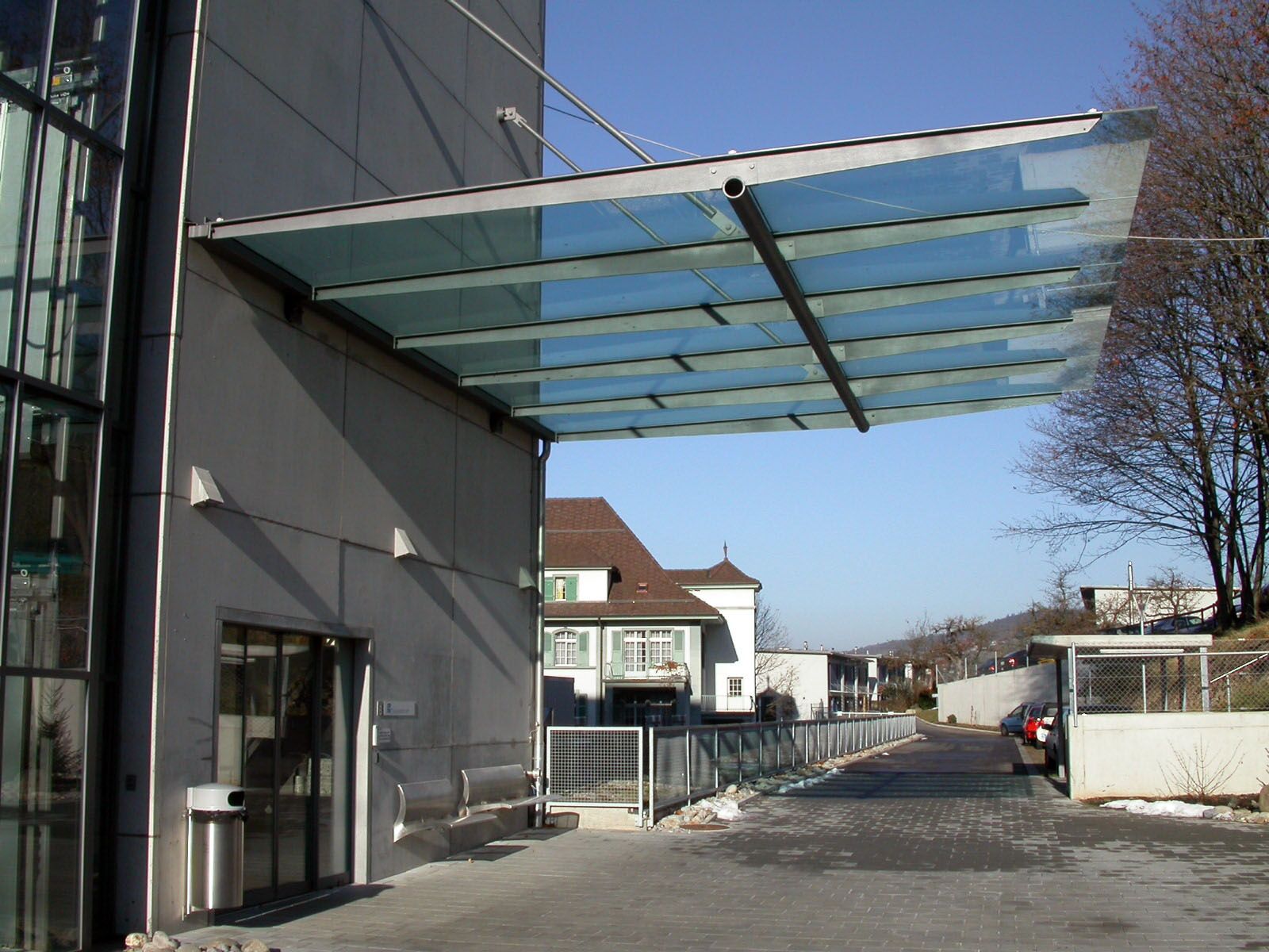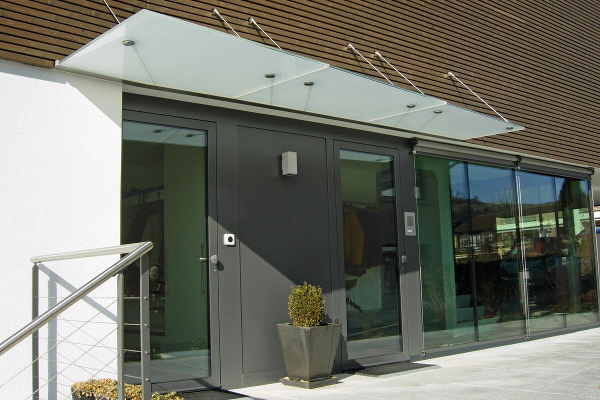 - Glasvordächer mit Glastragprofilen in T-Stahl mit Zugstangensystem an Fassade befestigt
