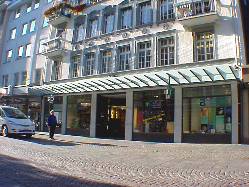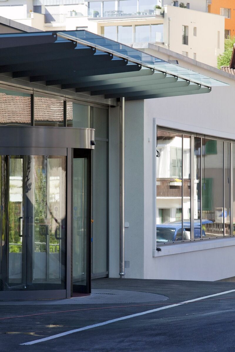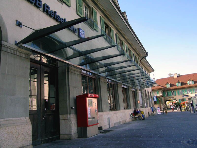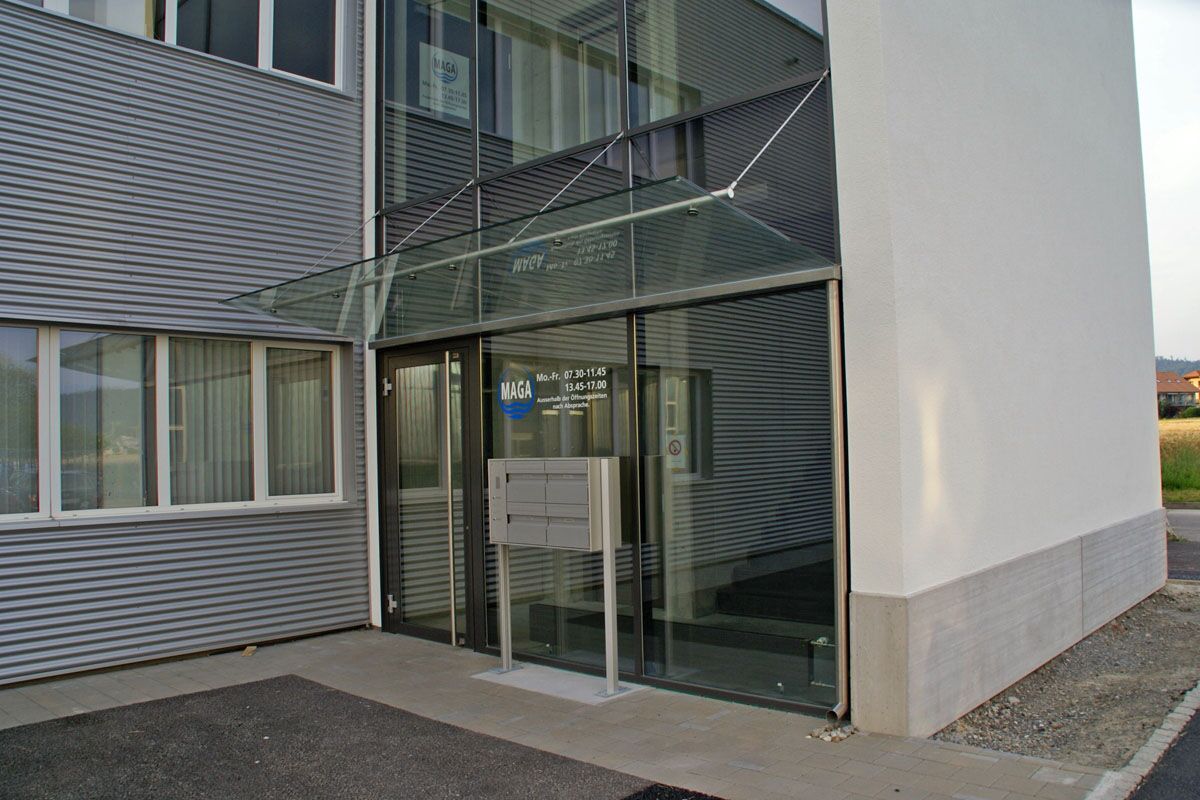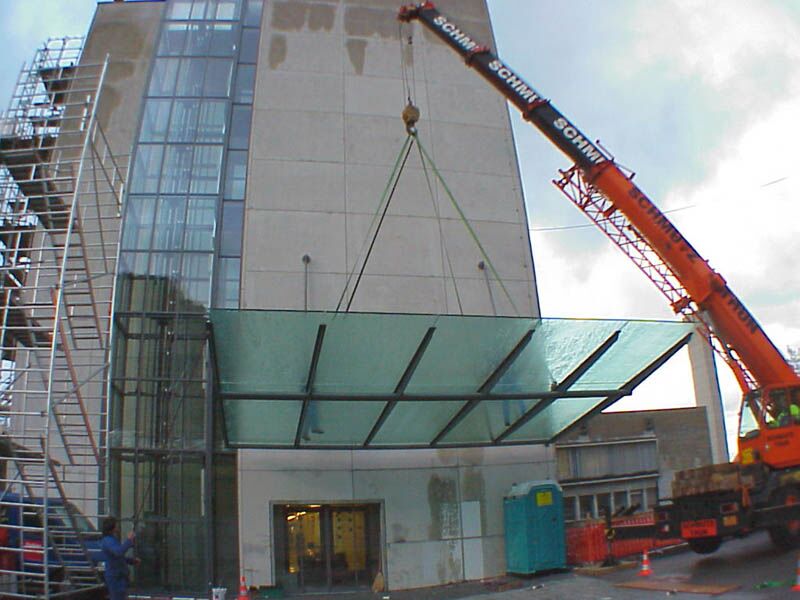 - Glasvordächer mit Glastragprofilen in T-Stahl mit Zugstangensystem an Fassade befestigt