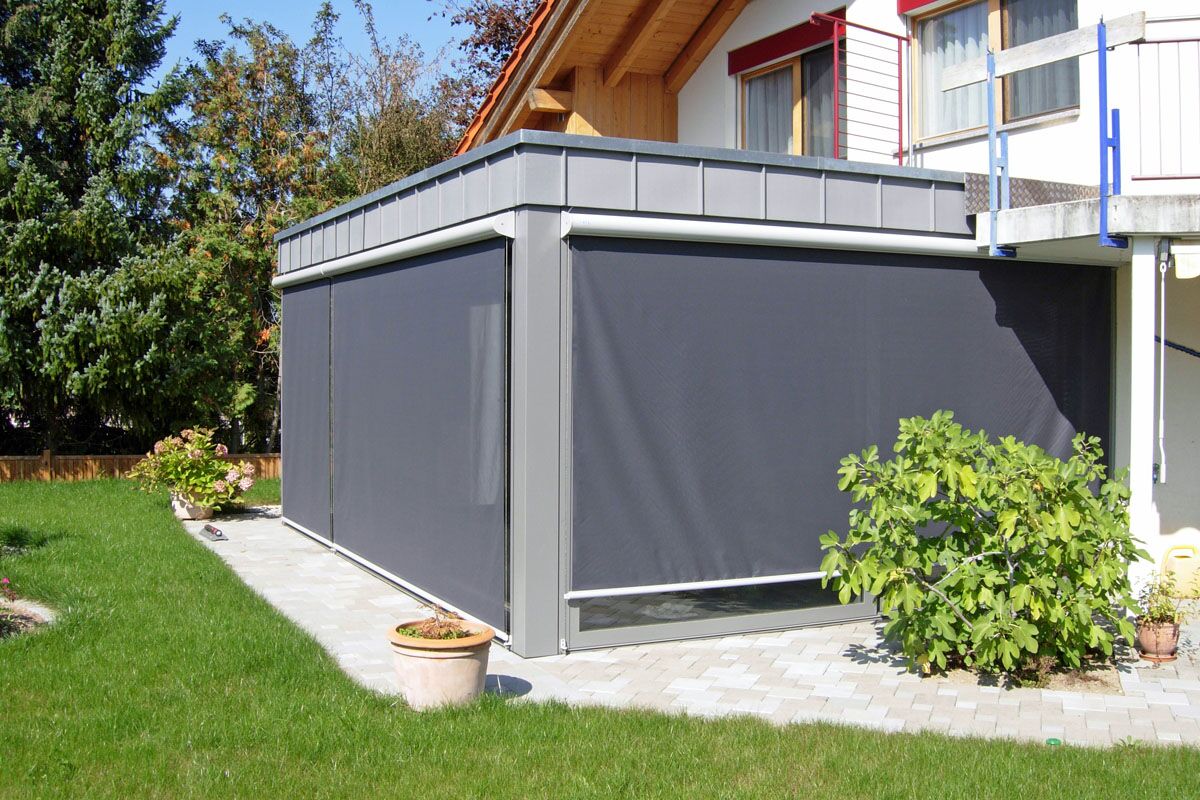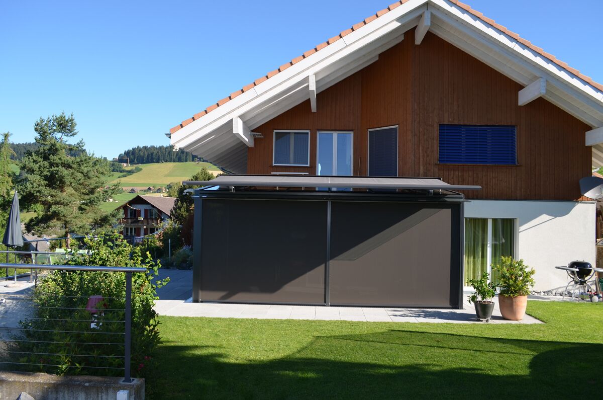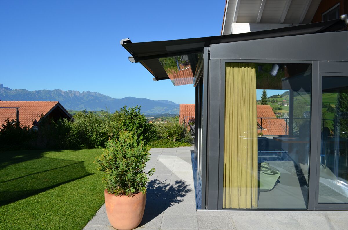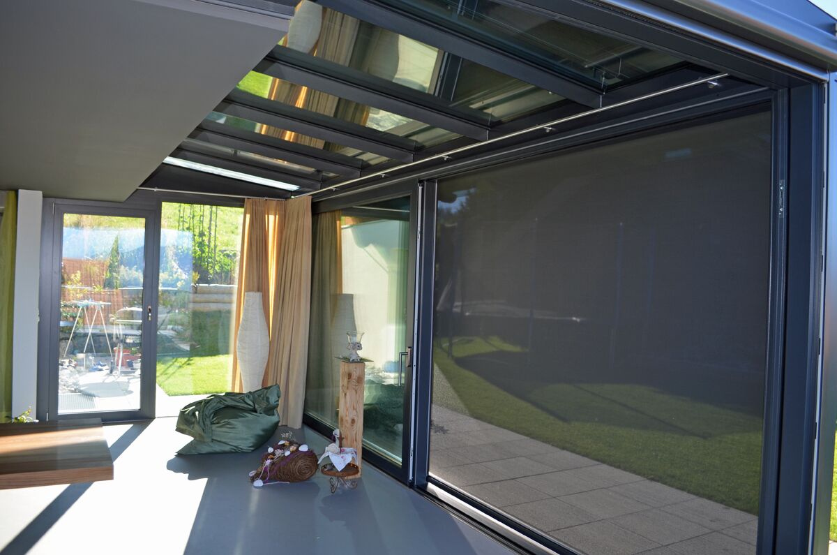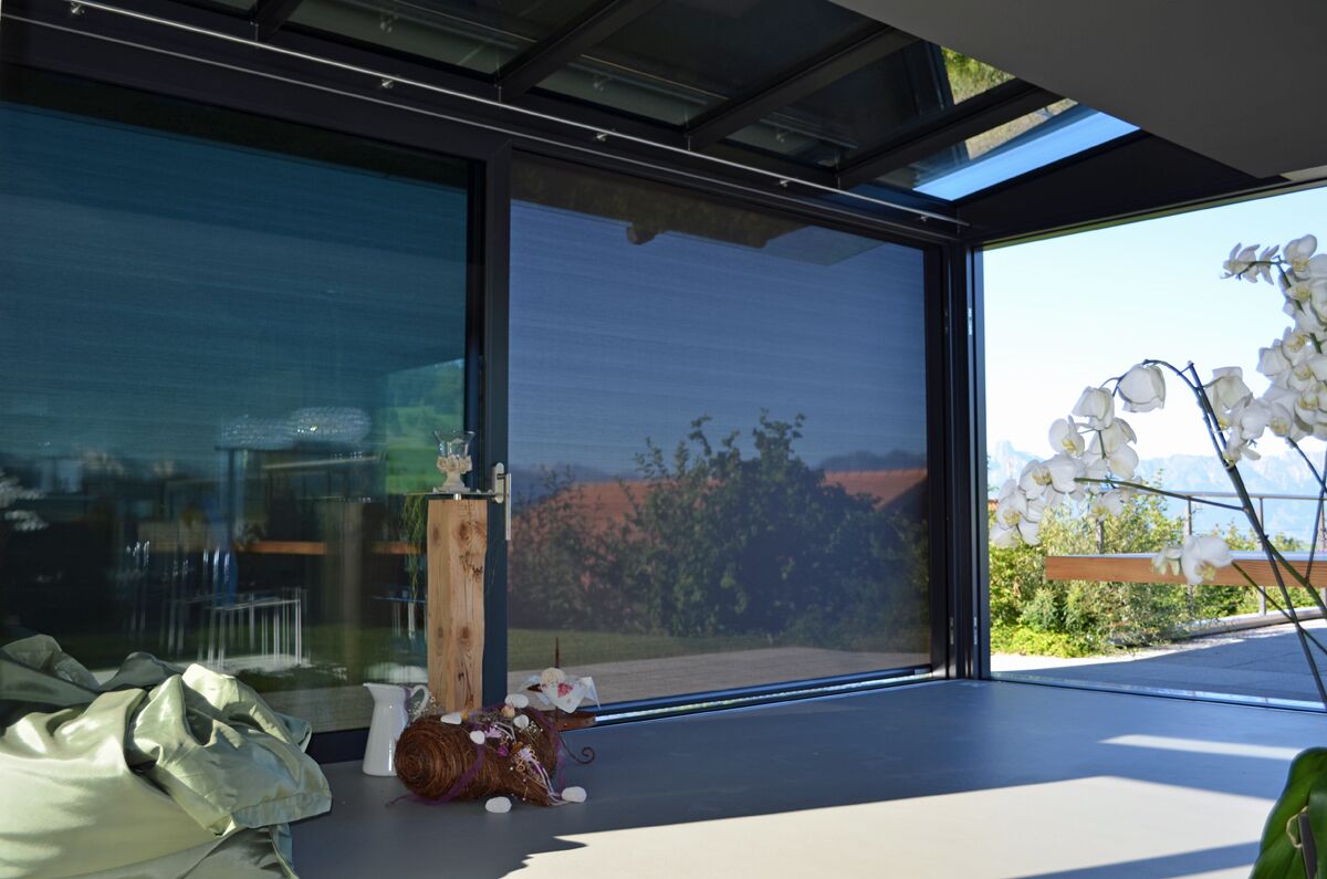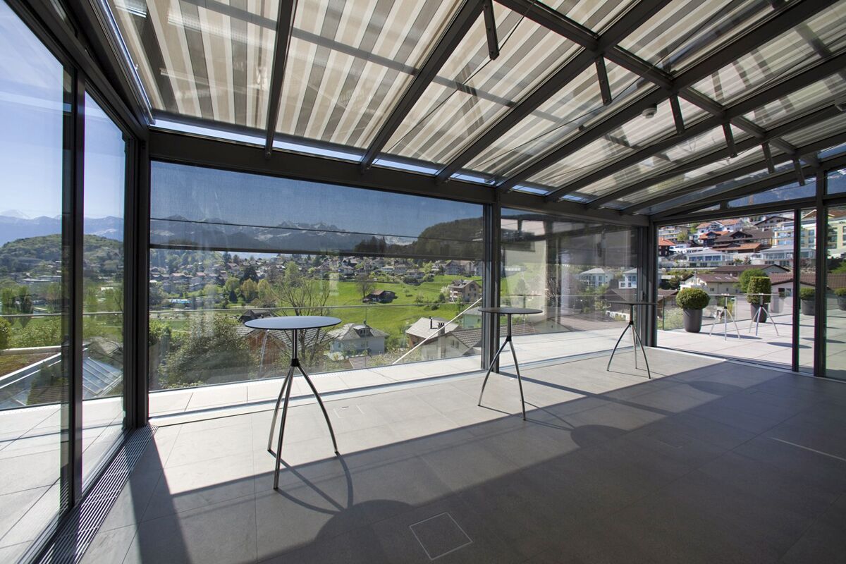 Ob Wintergarten, Sitzplatzverglasung, Balkonverglasung, oder Terrasse — damit wir Menschen uns wohl fühlen, muss die Sonneneinstrahlung angemessen reguliert werden können.