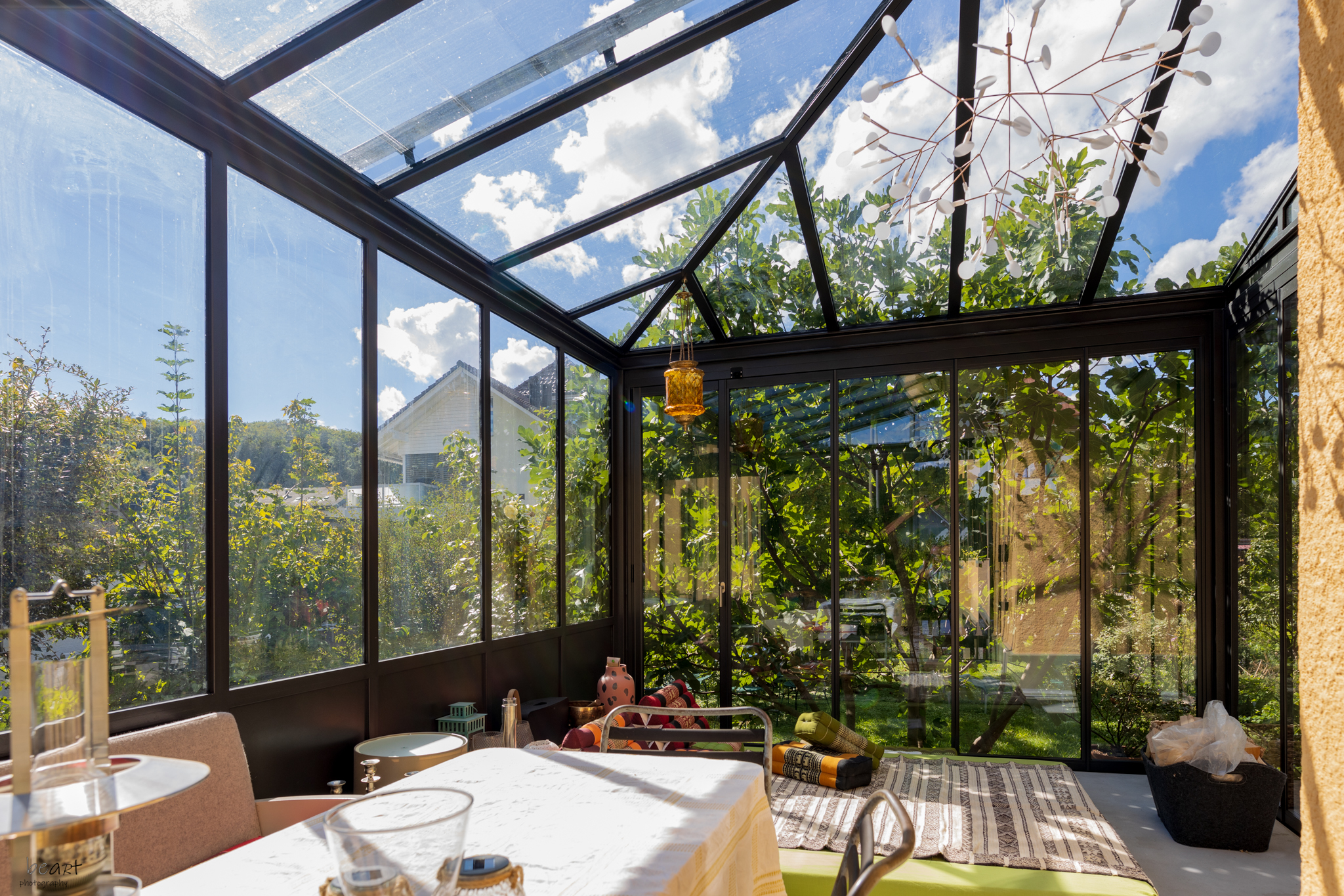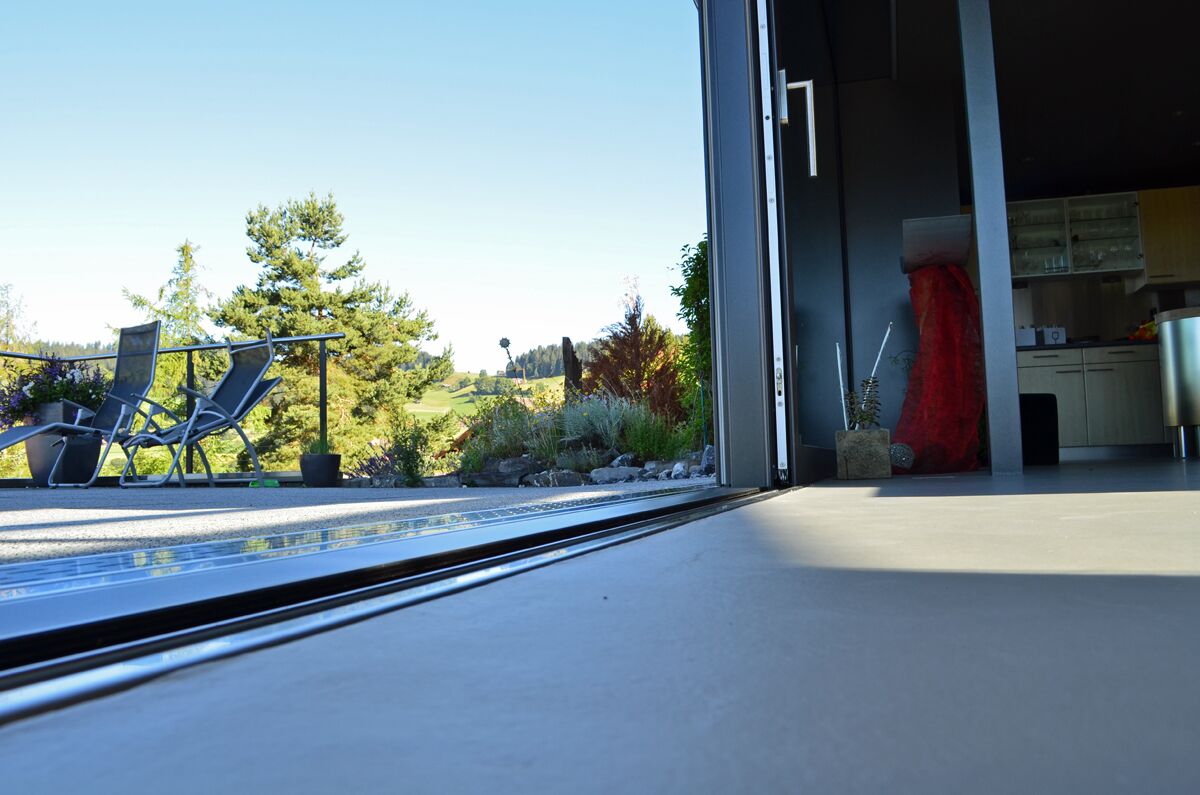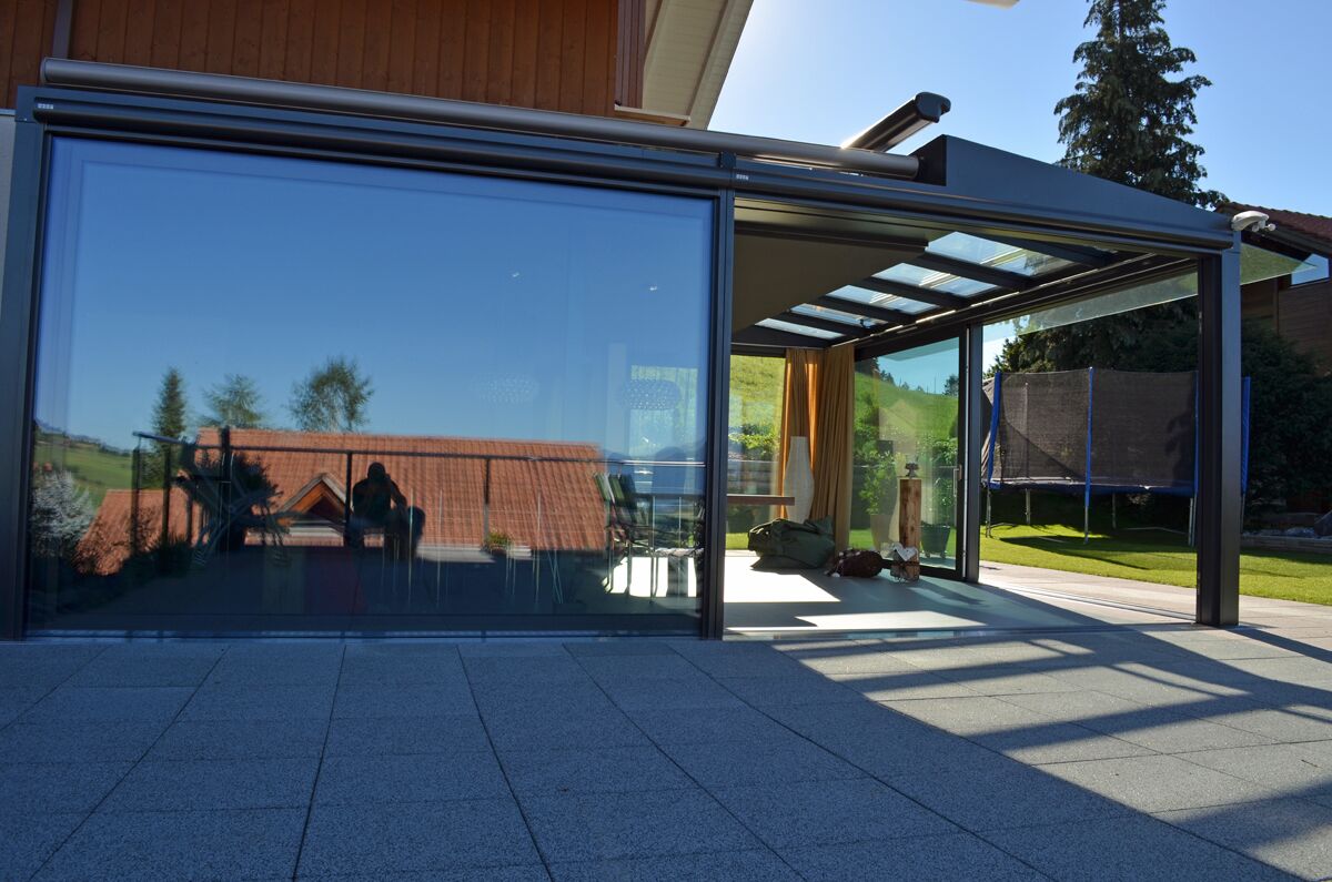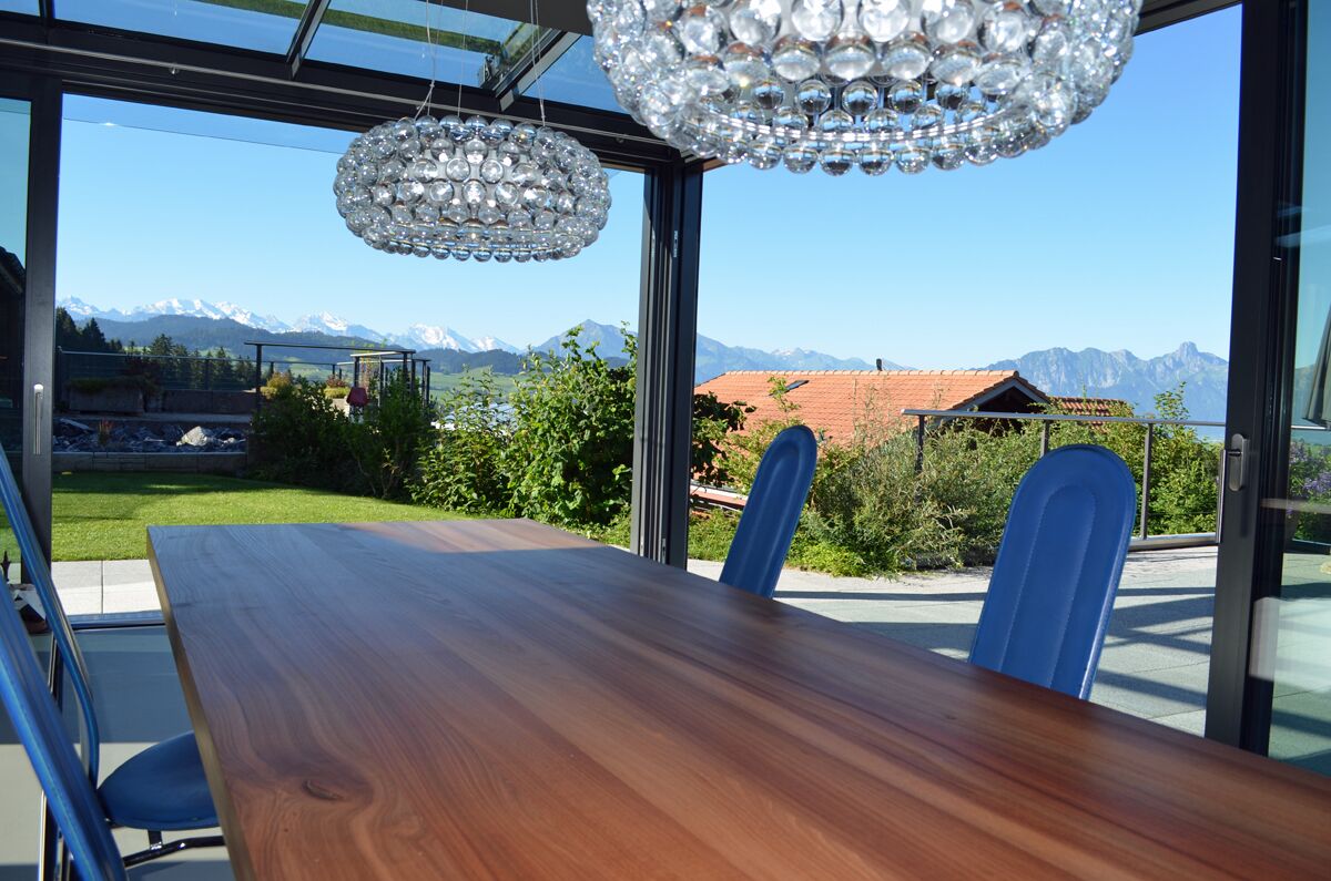 Wintergarten als erweiterter Wohnraum, grosszügige, schwellenlose Hebe-Schiebefenster
